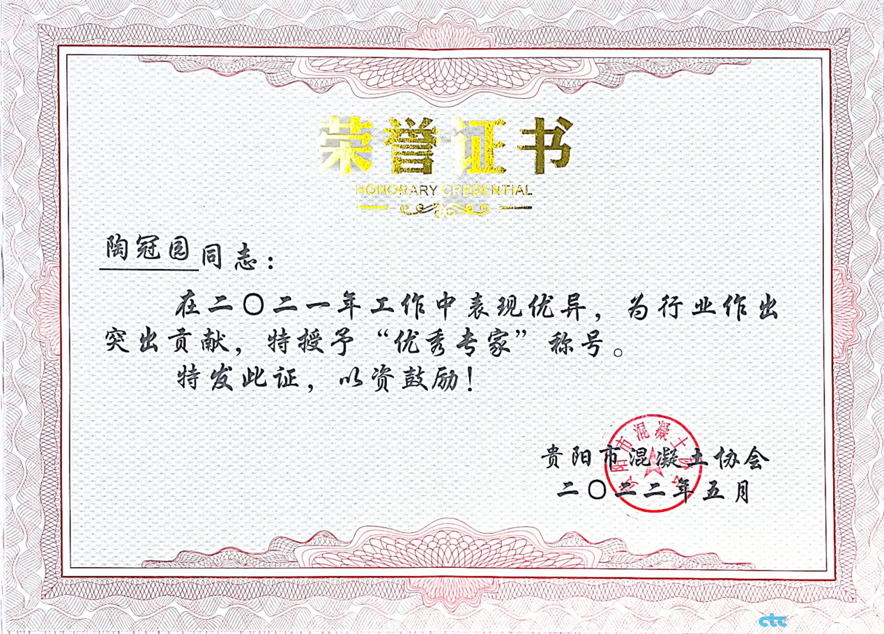 2022年5月30日下午,由貴陽市混凝土協(xié)會召開的貴陽市預(yù)拌混凝土行業(yè)實驗等級評定工作總結(jié)會上,我司員工朱若君、陶冠園在參與貴陽市混凝土企業(yè)專項實驗室等級評定工作中被貴陽市混凝土協(xié)會授予“2021年度優(yōu)秀專家”榮譽稱號。