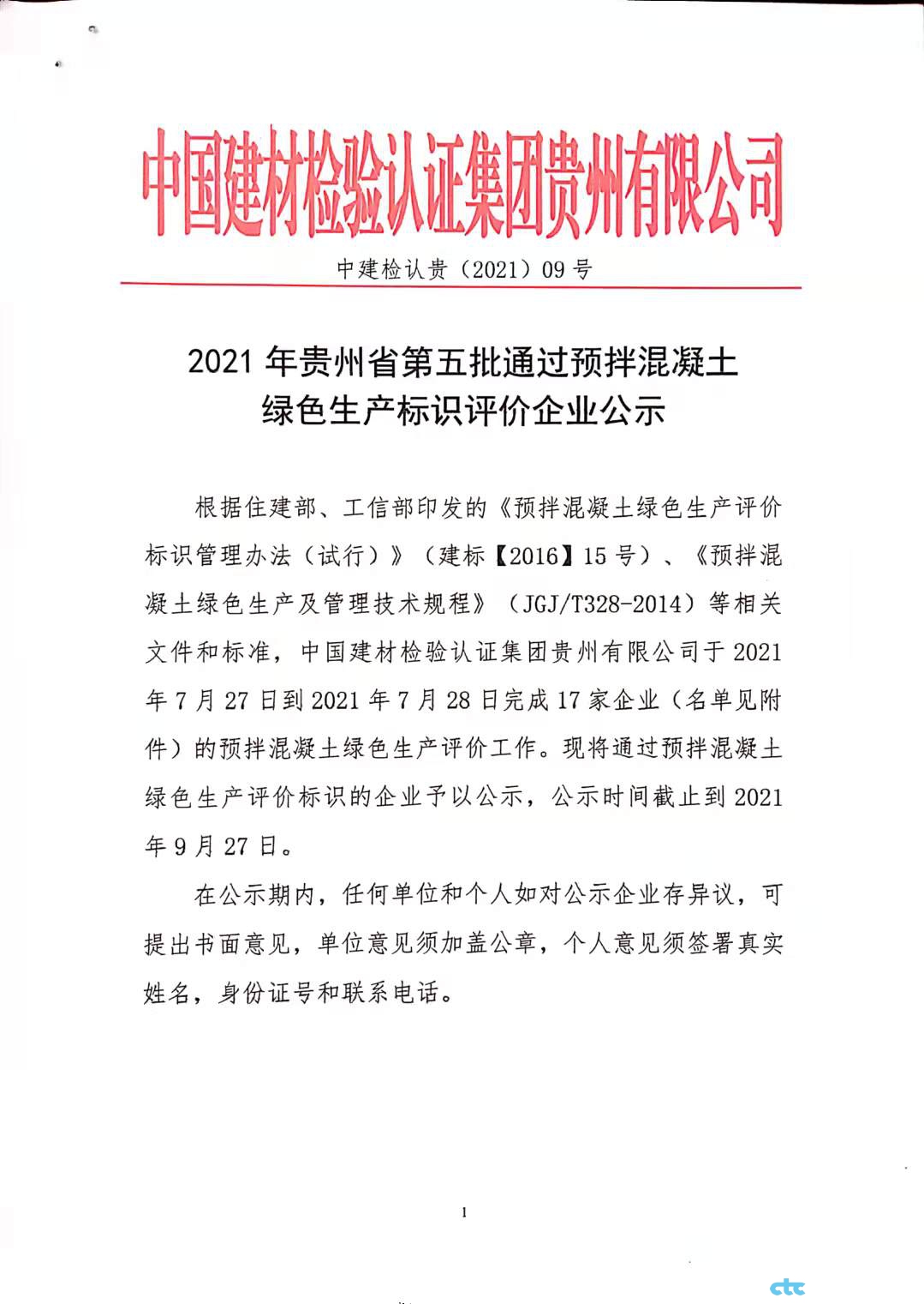 2021年貴州省第五批通過(guò)預(yù)拌混凝土綠色生產(chǎn)標(biāo)識(shí)評(píng)價(jià)企業(yè)公示