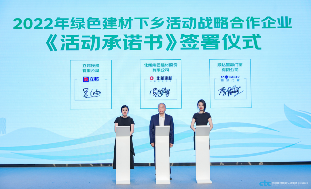 會上還發(fā)布了首批2022年綠色建材下鄉(xiāng)活動產(chǎn)品清單及企業(yè)名錄,正式啟動了綠色建材下鄉(xiāng)活動公共信息發(fā)布平臺及京東線上平臺,并對下一步工作進行了總體安排。國檢集團綠色建材產(chǎn)品認證客戶北新集團建材股份有限公司、立邦投資有限公司、順達墨瑟門窗有限公司的代表共同簽署了活動參與承諾書,承諾確保參加活動的產(chǎn)品及服務(wù)質(zhì)量,積極配合開展綠色建材下鄉(xiāng)活動,充分發(fā)揮引領(lǐng)示范作用。